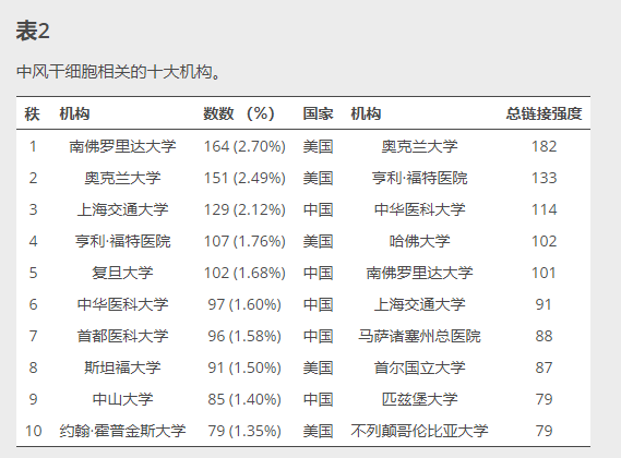 在中風干細胞研究方面排名前三的國家是美國、中國和日本。排名前十的國家有四個歐洲國家、四個亞太國家和兩個美洲國家。此外,前10名的研究機構中,有5家是美國的,其余5家是中國的。我們觀察到德國、日本、中國和美國這四個國家之間的密切配合。中國還積極與日本、加拿大和英國合作。上海交通大學、首都醫(yī)科大學、哈佛大學等學術機構之間合作良好。盡管奧克蘭大學在論文發(fā)表方面排名第二,但人們發(fā)現(xiàn)它與其他大學的合作有限。這種合作對于這些大學的長期學術進步是有害的。因此,確實有必要多國研究機構密切合作、交流,共同推動中風干細胞治療。