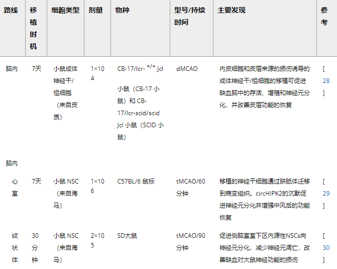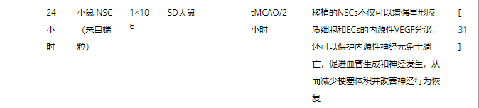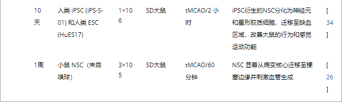 表1:靜脈和動(dòng)脈NSC移植治療腦缺血的代表性實(shí)驗(yàn)研究。