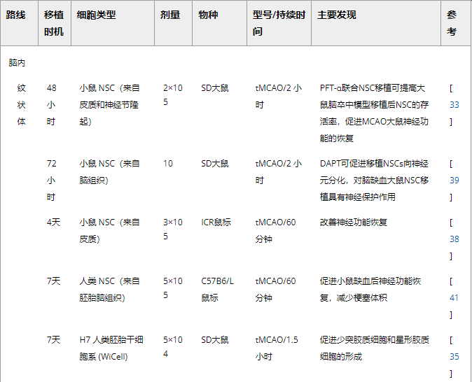 表2:腦內(nèi)(心室和紋狀體)NSC移植治療腦缺血的代表性實(shí)驗(yàn)研究。