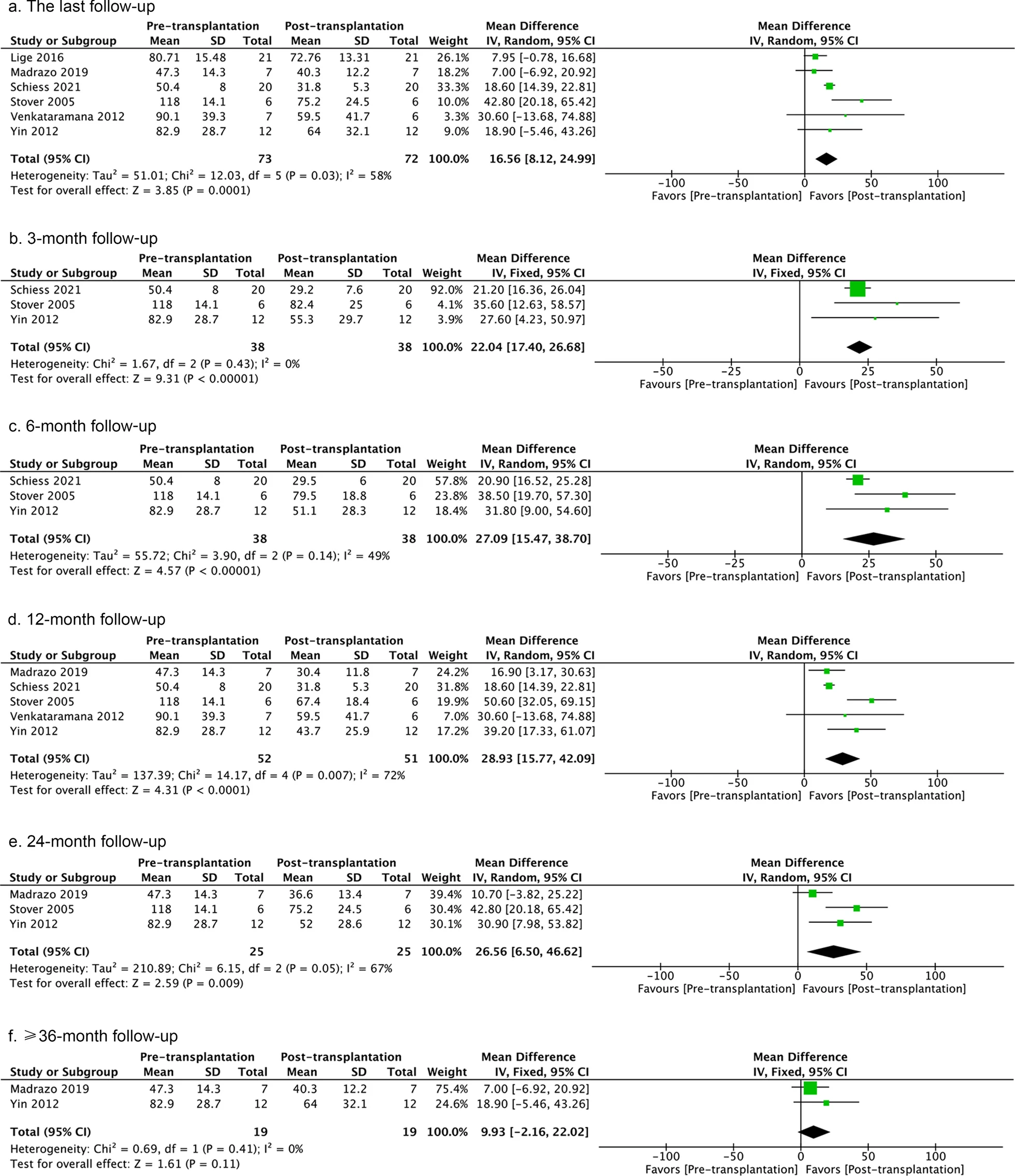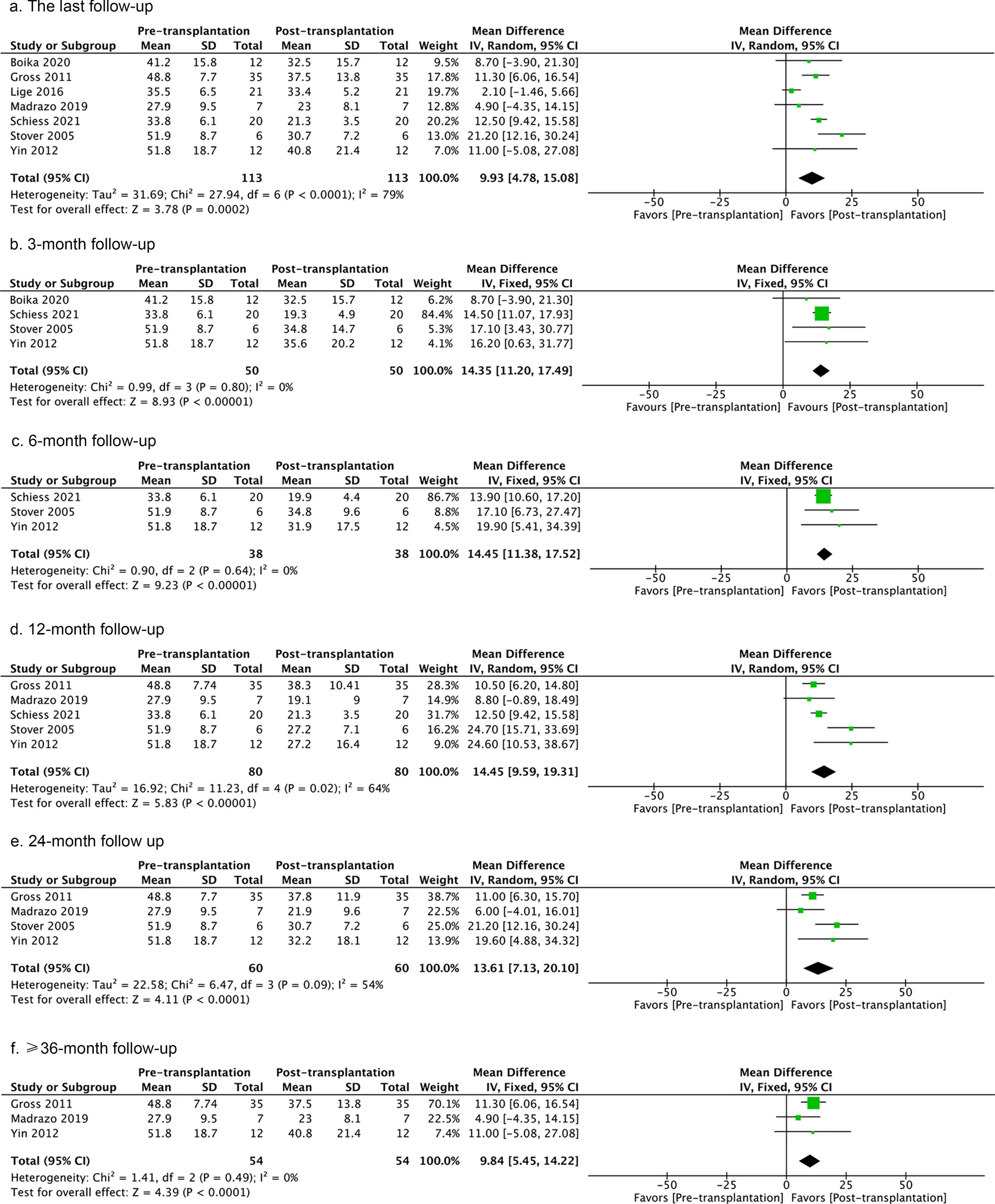 在3、6、12、24和≥36個月的隨訪中,對處于“關閉”狀態(tài)的細胞處理后的UPDRSIII評分進行分析,結果顯示出積極的效果。分析“開啟”狀態(tài)下的UPDRSIII評分顯示,與基線狀態(tài)相比,干細胞治療在6個月和24個月的隨訪中具有有益效果,但在最后一次隨訪以及3個月或12個月的隨訪中都沒有效果(圖4)。最后一次隨訪以及3、6和24個月隨訪時研究間異質性較低(圖4)。12個月的隨訪顯示出高度異質性。