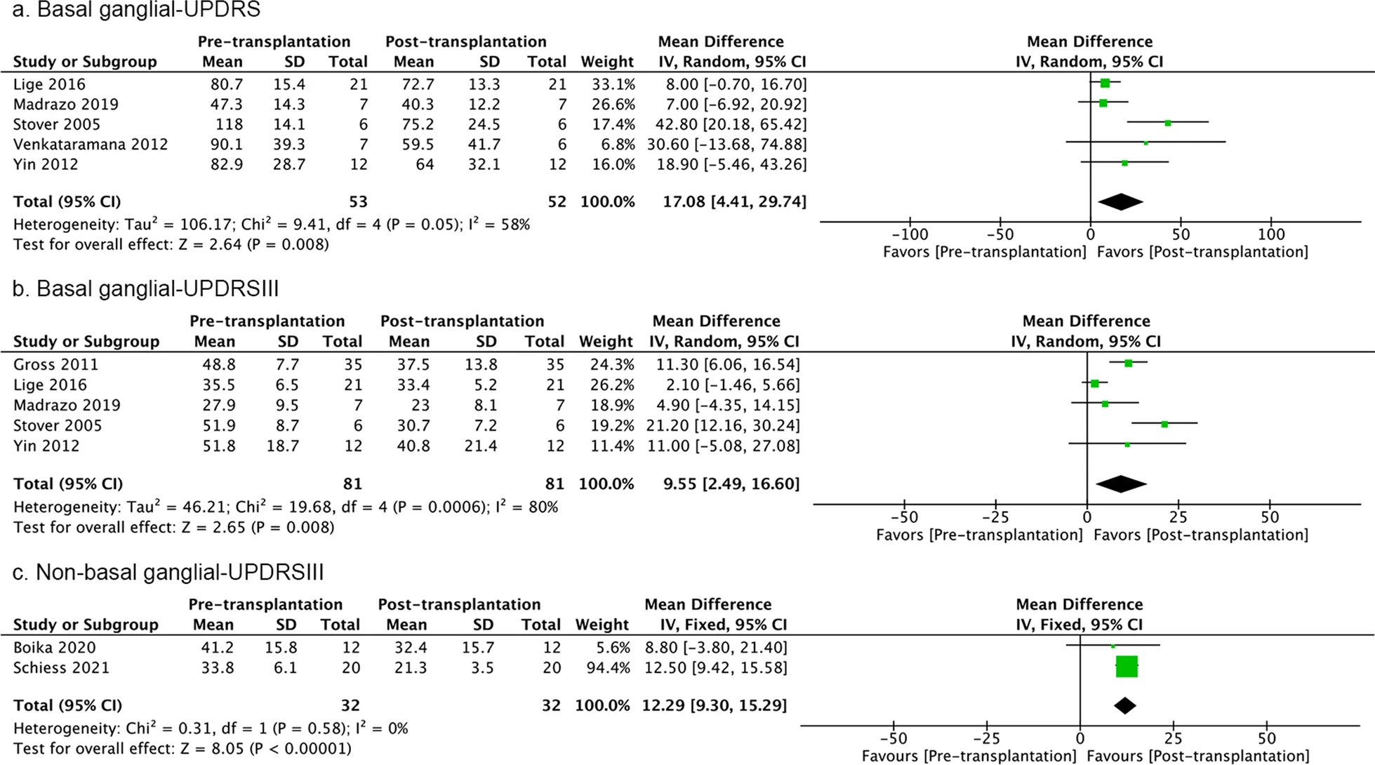七項研究測量了干細胞療法對運動癥狀的影響。使用隨機效應模型來比較研究最后一次隨訪時“關閉”狀態(tài)下治療前與治療后的UPDRSIII評分。細胞處理后薈萃分析得到了更好的結果,但異質性很高(圖3)。