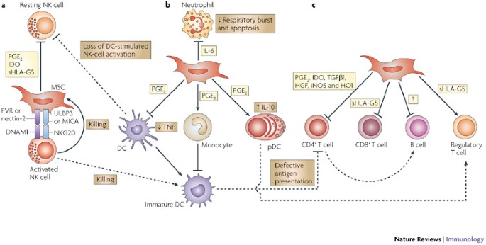 間充質(zhì)干細(xì)胞旁分泌因子在免疫調(diào)節(jié)、組織再生和愈合、抗纖維化、抗凋亡和血管生成 中發(fā)揮重要作用。因此成為治療炎癥性疾病的有效方法,例如多發(fā)性硬化癥 、克羅恩病、移植物抗宿主病、系統(tǒng)性紅斑狼瘡和1型糖尿病 。免疫調(diào)節(jié)依賴于間充質(zhì)干細(xì)胞與靶組織免疫微環(huán)境之間的相互作用。
