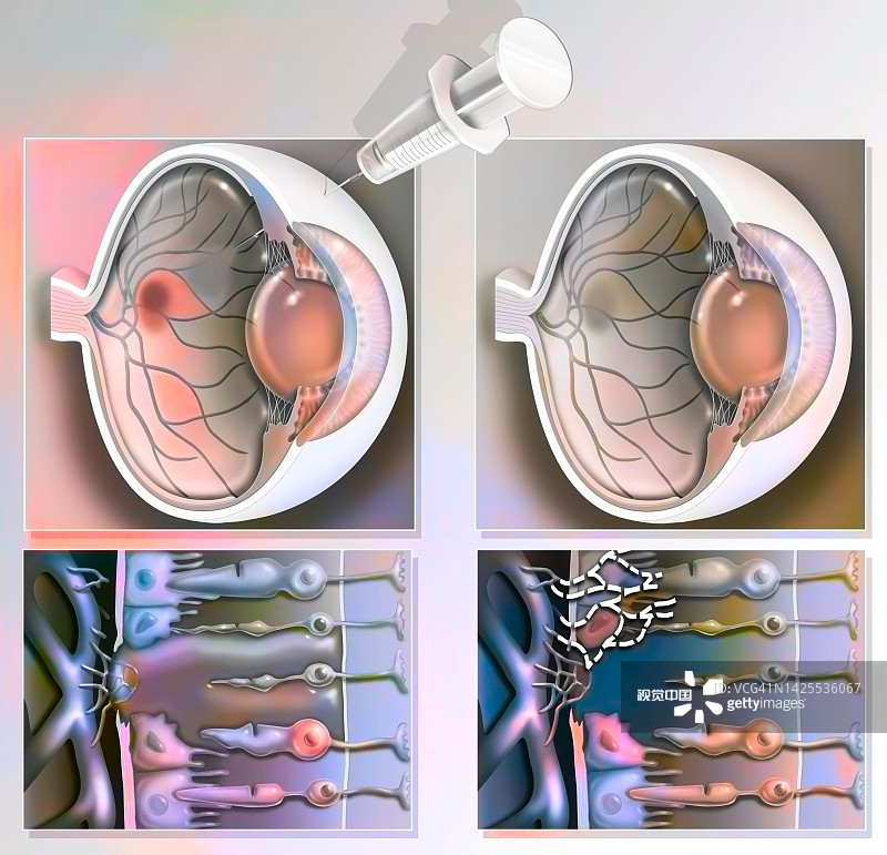 濕性AMD:對于濕性AMD,醫(yī)生使用藥物治療和手術技術來幫助保持現有視力。目前的一線治療是向患眼注射藥物以抑制新血管的形成。這些藥物會阻止血管內皮生長因子或VEGF的產生,VEGF會向身體發(fā)出信號以制造新血管。對于許多人來說,需要每四到六周重復注射一次。