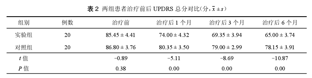 福州總醫(yī)院趙堂亮等選取20例患者經(jīng)鞘內(nèi)注射臍帶間充質(zhì)干細(xì)胞治療為實驗組,另選取20例經(jīng)口服左旋多巴治療原發(fā)性帕金森病患者為對照組。采用PD統(tǒng)一評分量表(UPDRS)對患者治療前及治療后1個月、3個月、6個月進(jìn)行量化評分。結(jié)果顯示實驗組20例患者臨床癥狀緩解程度較對照組明顯,結(jié)果如圖