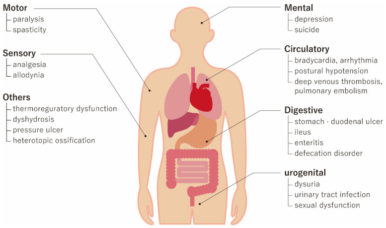 脊髓損傷(SCI)主要由交通事故、跌倒和運(yùn)動(dòng)相關(guān)損傷等嚴(yán)重外傷引起,全世界有超過 100 萬患者患有 SCI 相關(guān)癱瘓。隨著社會(huì)老齡化進(jìn)程的加快,老年SCI患者因低能量跌倒而增多。SCI 不僅會(huì)導(dǎo)致運(yùn)動(dòng)功能缺陷,例如癱瘓,還會(huì)導(dǎo)致許多其他嚴(yán)重的醫(yī)療問題,包括呼吸系統(tǒng)、泌尿生殖系統(tǒng)和皮膚問題(圖1) 。除了嚴(yán)重的醫(yī)療問題外,SCI患者通常都很年輕,需要更長時(shí)間的醫(yī)療和社會(huì)護(hù)理,導(dǎo)致嚴(yán)重的社會(huì)經(jīng)濟(jì)問題,不僅對患者及其護(hù)理人員,而且對社會(huì)也是如此。