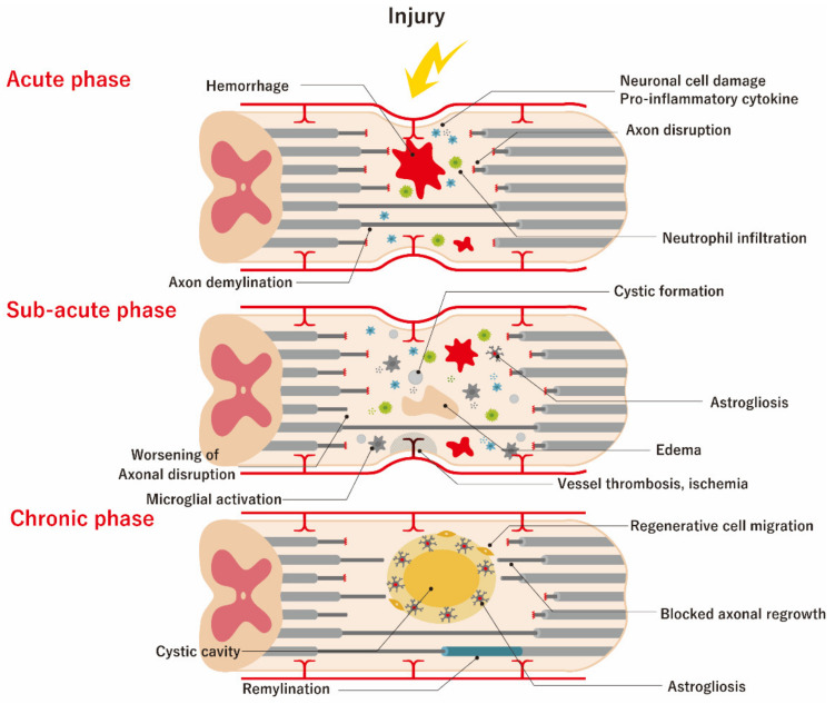 SCI包括兩種截然不同的機制。一種是脊髓受壓挫傷引起的原發(fā)性損傷,導(dǎo)致?lián)p傷時神經(jīng)元和神經(jīng)膠質(zhì)細胞膜的損傷以及微血管系統(tǒng)的破壞。另一種是繼發(fā)性損傷級聯(lián),包括出血和水腫引起的組織腫脹、炎癥、細胞毒性自由基和興奮性毒性物質(zhì)的產(chǎn)生以及過度神經(jīng)膠質(zhì)增生,其發(fā)展需要數(shù)小時至數(shù)月。常規(guī)進行超早期手術(shù)干預(yù),包括脊髓減壓和脊柱固定,但通常很難從SCI中完全恢復(fù),因為原發(fā)性損傷在受傷時已經(jīng)發(fā)生。因此,目前脊髓損傷治療的主要目標是減少或停止繼發(fā)性損傷級聯(lián),繼發(fā)性損傷級聯(lián)可分為急性(數(shù)日內(nèi))、亞急性(數(shù)日至6個月)和慢性(>6個月)相 (圖2)。