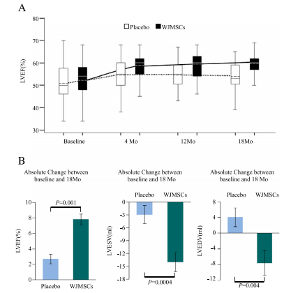 在隨訪的第3、6和12個月時經(jīng)胸超聲心動圖和心臟MRI評估,只有經(jīng)UC-MSCs治療組顯示出左心室射血分?jǐn)?shù)的顯著改善。兩組間超聲心動圖左心室射血分?jǐn)?shù)從基線到第12個月的變化差異顯著。