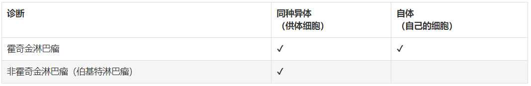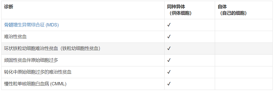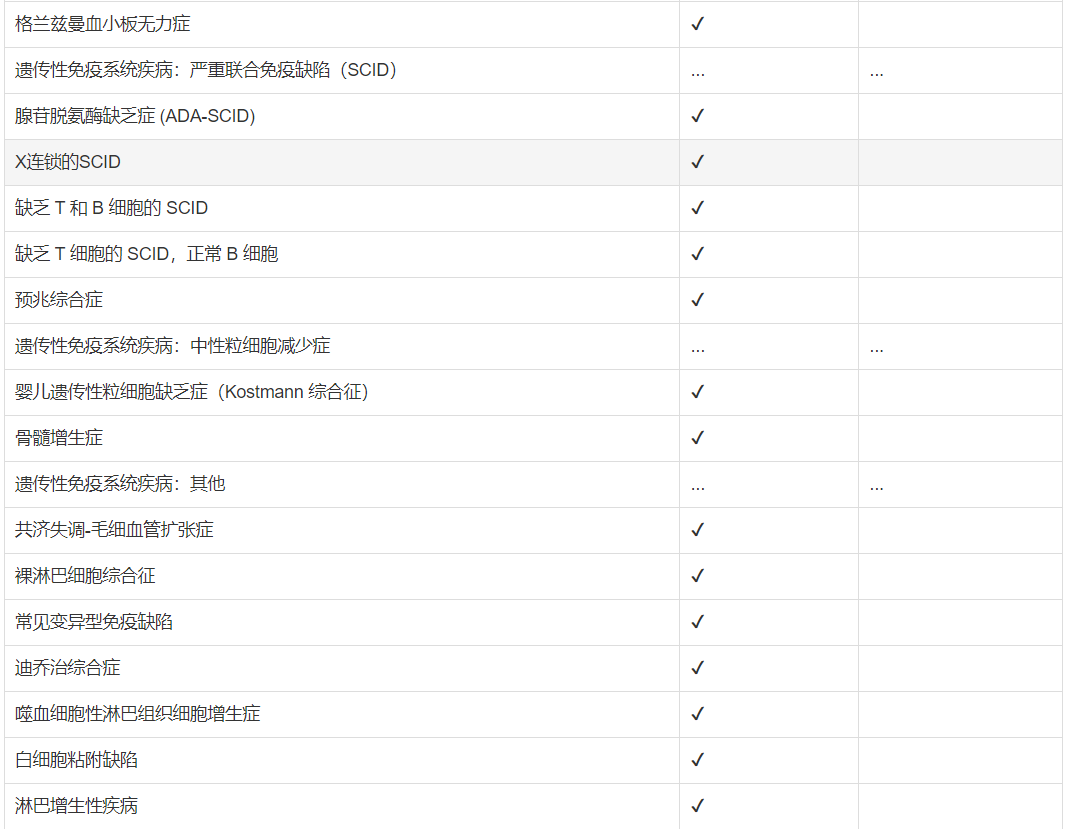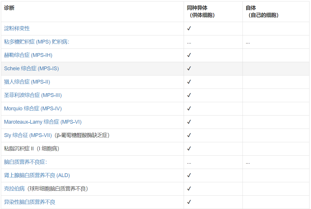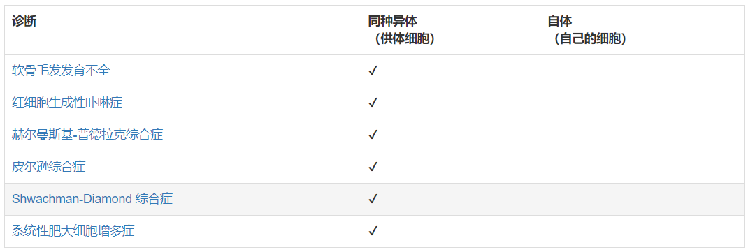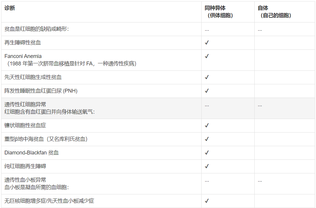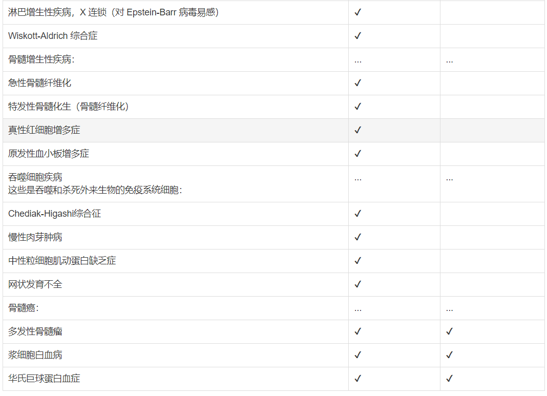 下面的列表包括所有使用造血干細(xì)胞的療法,不區(qū)分干細(xì)胞是從骨髓、外周血還是臍帶血中提取的。在美國,如果干細(xì)胞移植是患者診斷的“標(biāo)準(zhǔn)療法”,大多數(shù)健康保險(xiǎn)提供商都會(huì)支付干細(xì)胞移植費(fèi)用。