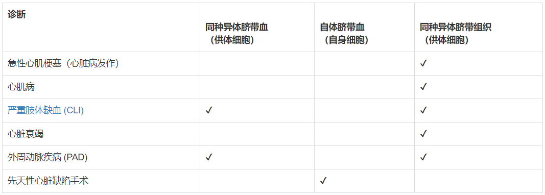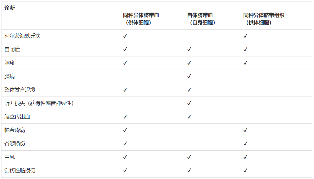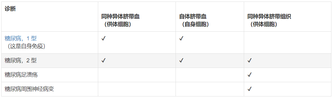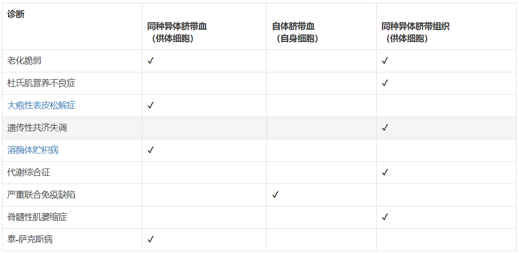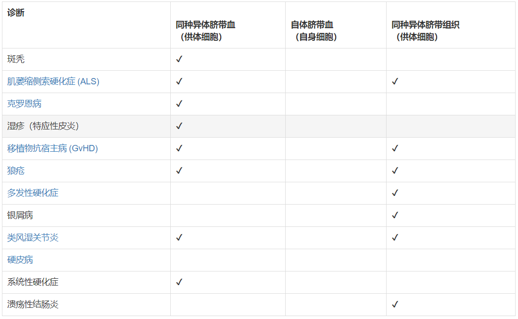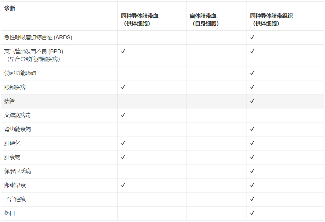 已在臍帶血或臍帶組織細(xì)胞臨床試驗(yàn)中的疾病和病癥