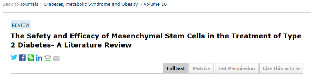 「3」Aanchal Mathur, Sebastien Taurin, Sfoug Alshammary,The Safety and Efficacy of Mesenchymal Stem Cells in the Treatment of Type 2 Diabetes- A Literature Review,Diabetes Metab Syndr Obes. 2023 Mar14;16:769-777.doi:10.2147/DMSO.S392161. eCollection 2023.