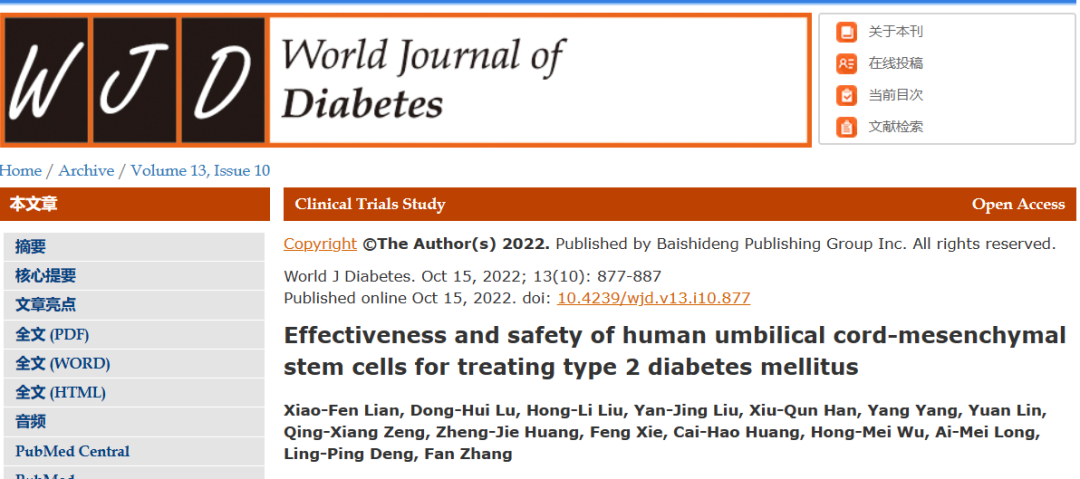 「4」Xiao-Fen Lian, Dong-Hui Lu, Hong-Li Liu,Effectiveness and safety of human umbilical cord-mesenchymal stem cells for treating type 2 diabetes mellitus,World J Diabetes. 2022 Oct15;13(10):877-887.doi:10.4239/wjd.v13.i10.877.