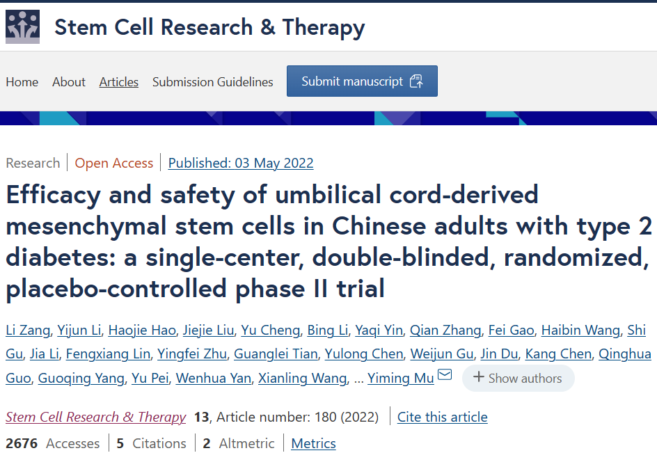 「5」Li Zang, Yijun Li,Yiming Mu,Efficacy and safety of umbilical cord-derived mesenchymal stem cells in Chinese adults with type 2 diabetes: a single-center, double-blinded, randomized, placebo-controlled phase II trial,Stem Cell Res Ther. 2022 May 3;13(1):180. doi: 10.1186/s13287-022-02848-6.
