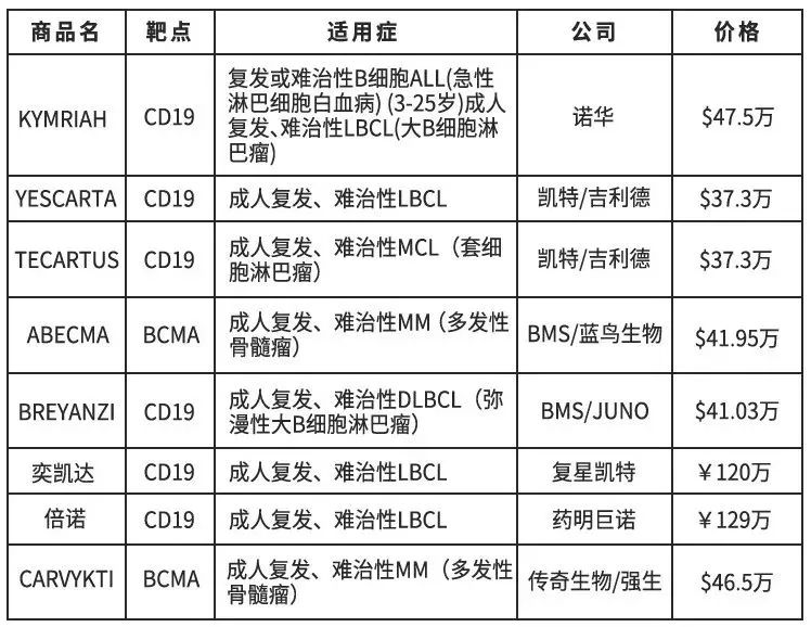 國(guó)內(nèi)已批準(zhǔn)復(fù)星凱特、藥明巨諾2款靶向于CD19的CAR-T療法、而信達(dá)生物/馴鹿醫(yī)療的BCMACAR-T療法正在申請(qǐng)上市,此外美國(guó)已批準(zhǔn)傳奇生物開(kāi)發(fā)的BCMACAR-T。