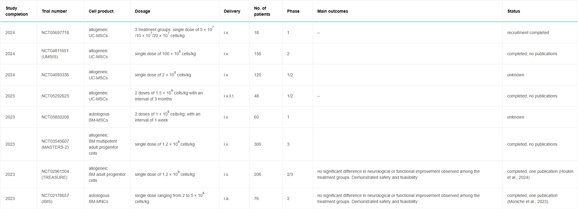 迄今為止,僅在2024年期間開展過一項Ⅱ/Ⅲ期試驗——TREASURE研究,該研究評估了靜脈注射骨髓源性多潛能成體祖細(xì)胞對缺血性卒中患者的療效。
