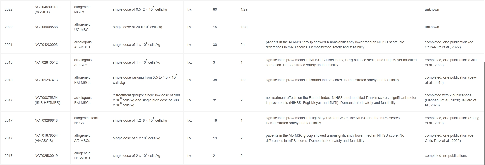 表1:干細(xì)胞治療成人缺血性中風(fēng)的部分臨床試驗摘要(2017年至今)