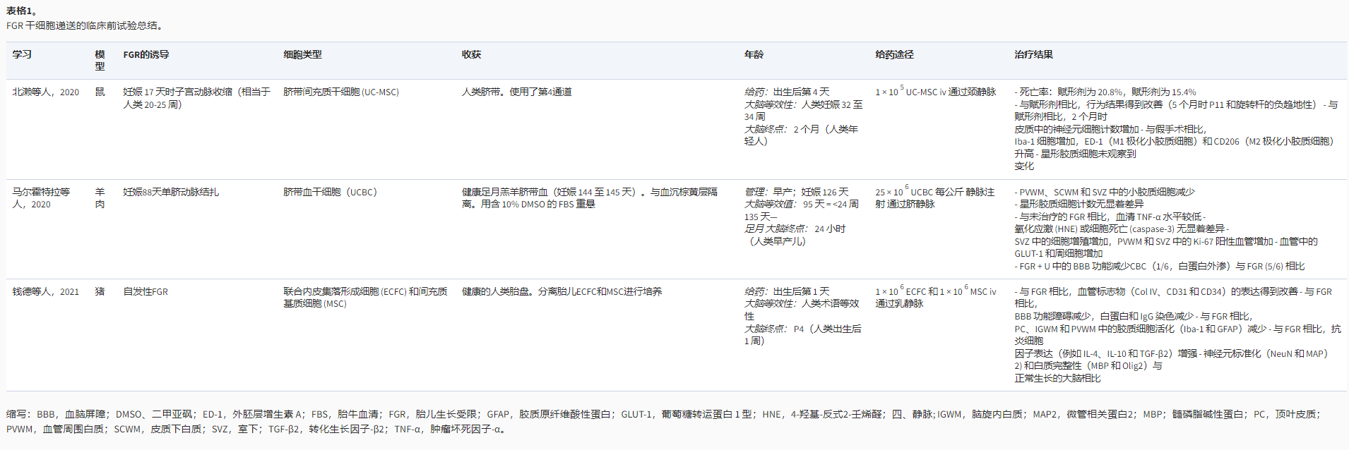 除了缺乏FGR嬰兒的臨床試驗(yàn)外,臨床前動物模型研究也有限,迄今為止發(fā)表的研究僅有3篇(表1)。這些研究,包括FGR大鼠模型和2項(xiàng)大型動物研究,顯示出有希望的神經(jīng)保護(hù)結(jié)果,報告了大腦干細(xì)胞治療后的多區(qū)室益處。