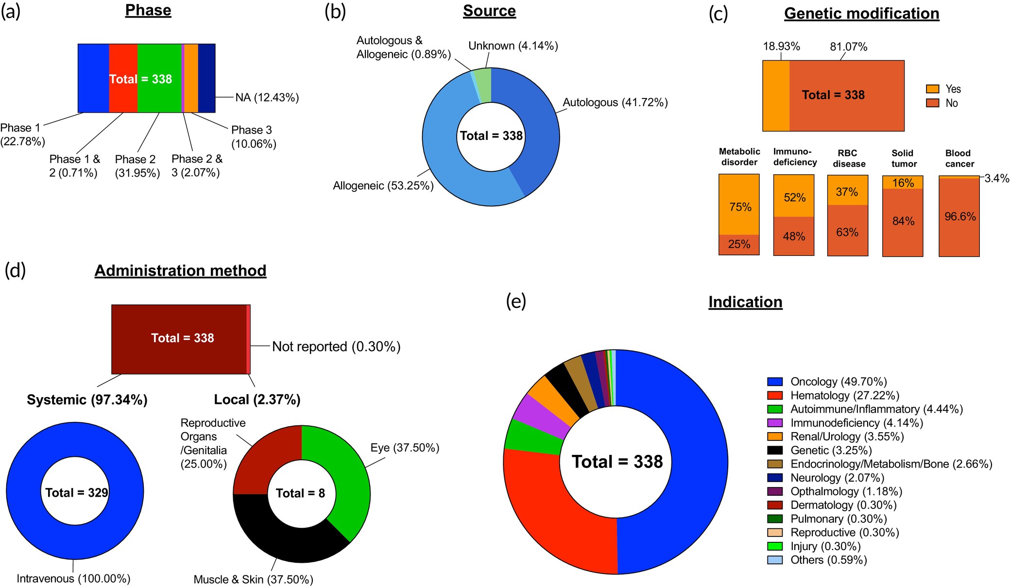 對346項(xiàng)MSC臨床試驗(yàn)進(jìn)行了分析,并根據(jù)以下標(biāo)準(zhǔn)進(jìn)行了分類:(a) 試驗(yàn)階段;(b) 細(xì)胞來源;(c) 給藥方法,進(jìn)一步分為全身和局部途徑;(d) 適應(yīng)癥類型。不適用 (NA)。