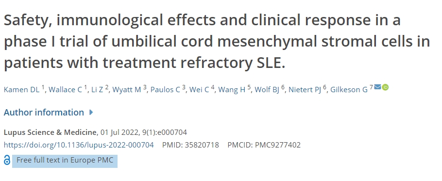 2022年,《狼瘡科學(xué)醫(yī)學(xué)》期刊雜志發(fā)表了一篇“臍帶間充質(zhì)基質(zhì)細(xì)胞治療難治性SLE患者的I期臨床試驗(yàn)的安全性、免疫學(xué)效果和臨床反應(yīng)”臨床研究的結(jié)果。