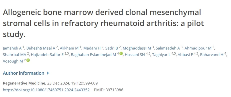 2024年,《再生醫(yī)學(xué)》雜志發(fā)表了一篇“同種異體骨髓衍生的克隆間充質(zhì)基質(zhì)細(xì)胞在難治性類風(fēng)濕性關(guān)節(jié)炎中的應(yīng)用:一項(xiàng)初步研究的結(jié)果”。
