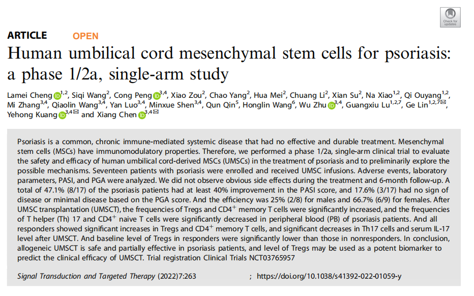 日前,中南大學(xué)湘雅醫(yī)院在Nature子刊《signal transduction and targeted therapy》發(fā)表干細(xì)胞治療銀屑病最新臨床研究結(jié)果。該臨床試驗(yàn)揭示了人臍帶來(lái)源間充質(zhì)干細(xì)胞對(duì)銀屑病患者是安全和有效的。