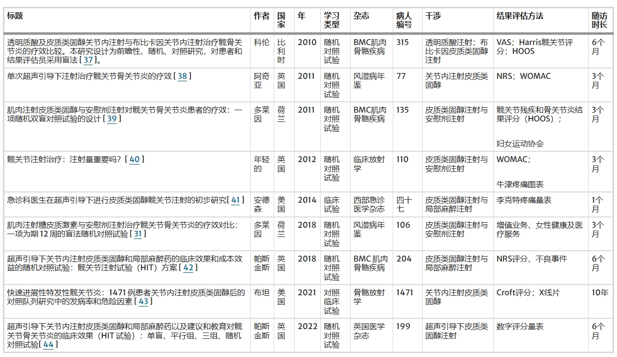 該綜述表明:與物理治療、口服止痛藥等非手術(shù)治療相比,關(guān)節(jié)腔內(nèi)注射治療藥物具有安全性高、療效顯著等特點(diǎn),且與外科手術(shù)相比,關(guān)節(jié)腔內(nèi)注射具有創(chuàng)傷性小、不良反應(yīng)少等特點(diǎn)。