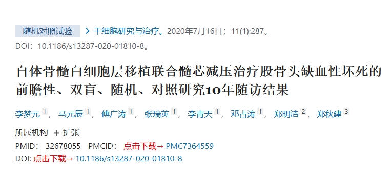 2020年,在一項(xiàng)為期10年的前瞻性、雙匿名、隨機(jī)對照臨床試驗(yàn)中,李采用MSCs治療股骨頭壞死患者。該研究包括43名接受干細(xì)胞注射的患者,隨后進(jìn)行了十年的觀察期。研究結(jié)果表明,干細(xì)胞治療與髓芯減壓相結(jié)合比單獨(dú)減壓治療可帶來更顯著的臨床益處。