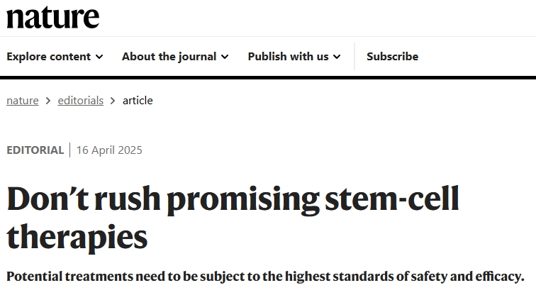 2025年4月16號(hào),國(guó)際期刊雜志《Nature》發(fā)表了一篇“Don’t rush promising stem-cell therapies”(不要急于推廣有前景的干細(xì)胞療法)的社論,社論表明潛在的治療需要遵循最高的安全性和有效性標(biāo)準(zhǔn)。