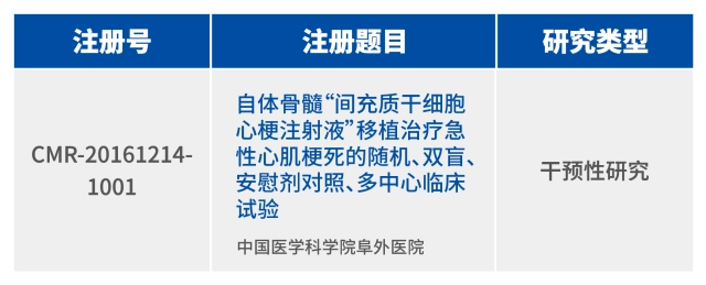 2016年年底,在我國醫(yī)學(xué)研究備案登記信息系統(tǒng)中,干細(xì)胞臨床研究項(xiàng)目《自體骨髓“間充質(zhì)干細(xì)胞心梗注射液”移植治療急性心肌梗死的隨機(jī)、雙盲、安慰劑對(duì)照、多中心臨床試驗(yàn)》獲得國家備案,得到了國家干細(xì)胞臨床研究專家委員會(huì)的集體認(rèn)可。