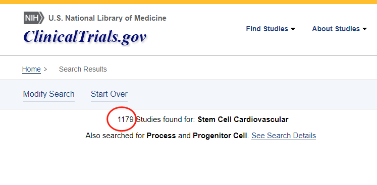 截止2022年12月,在美國國立衛(wèi)生研究院的最大臨床試驗(yàn)注冊(cè)庫clinicaltrials.gov網(wǎng)站上注冊(cè)的有關(guān)干細(xì)胞治療心血管疾病的臨床研究項(xiàng)目有1179項(xiàng)。