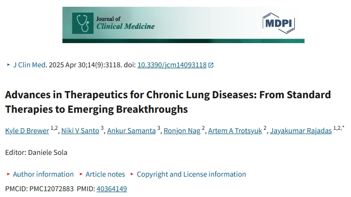 參考資料:[1]Brewer KD, Santo NV, Samanta A, Nag R, Trotsyuk AA, Rajadas J. Advances in Therapeutics for Chronic Lung Diseases: From Standard Therapies to Emerging Breakthroughs. J Clin Med. 2025 Apr 30;14(9):3118. doi: 10.3390/jcm14093118. PMID: 40364149; PMCID: PMC12072883.