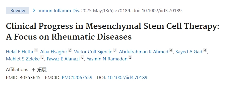 [6]Hetta HF, Elsaghir A, Sijercic VC, Ahmed AK, Gad SA, Zeleke MS, Alanazi FE, Ramadan YN. Clinical Progress in Mesenchymal Stem Cell Therapy: A Focus on Rheumatic Diseases. Immun Inflamm Dis. 2025 May;13(5):e70189. doi: 10.1002/iid3.70189. PMID: 40353645; PMCID: PMC12067559.