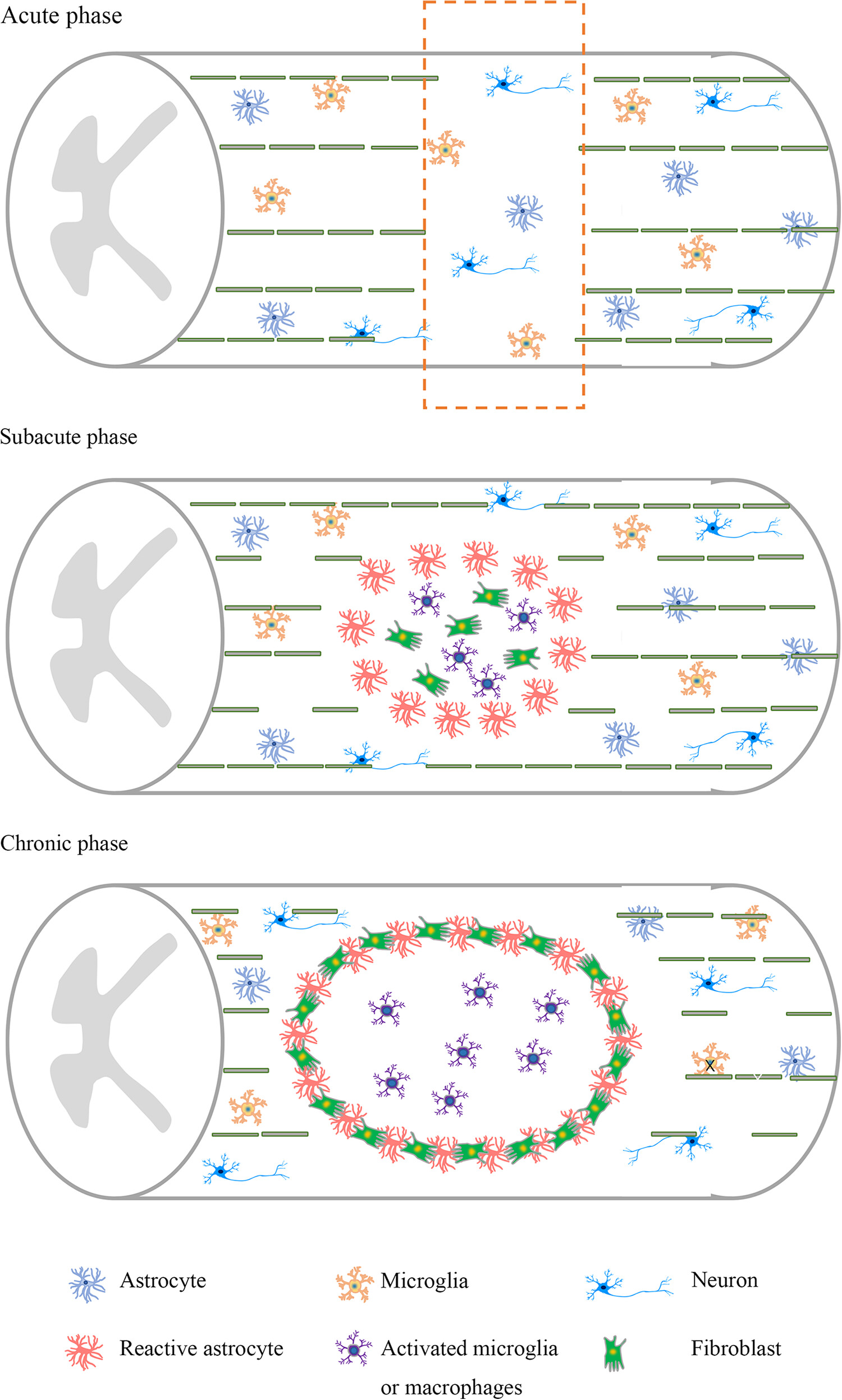 神經(jīng)元凋亡和軸突損傷在急性期很常見。在亞急性期,神經(jīng)元、軸突和髓磷脂大量丟失。活化的星形膠質(zhì)細胞、活化的小膠質(zhì)細胞和巨噬細胞在損傷部位聚集。慢性期進一步形成膠質(zhì)瘢痕和損傷腔,形成抑制性微環(huán)境。