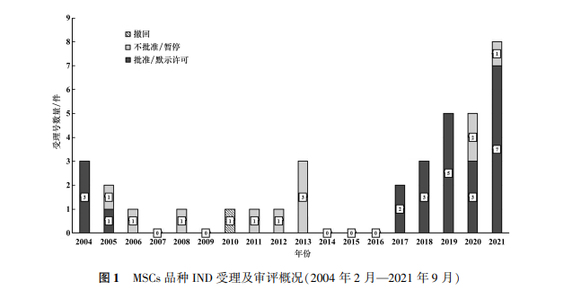 除特別審批品種以外,2004年2月—2020年12月,國(guó)家藥品監(jiān)督管理局藥品審評(píng)中心受理MSCs產(chǎn)品的注冊(cè)申請(qǐng)有36件(以受理號(hào)計(jì)),共計(jì)27個(gè)品種[1],均為新藥(investigational new drug application,IND) 臨床試驗(yàn)的申請(qǐng),目前尚無(wú)干細(xì)胞產(chǎn)品批準(zhǔn)上市。 MSCs品種在各個(gè)年份的申請(qǐng)數(shù)量及審評(píng)結(jié)局見(jiàn)圖1。雖然近10余年,我國(guó)的干細(xì)胞臨床研究數(shù)量總體是穩(wěn)步增加的[2],但按照藥品申報(bào)的MSCs品種的數(shù)量受國(guó)家頒布的細(xì)胞治療相關(guān)政策法規(guī)和技術(shù)發(fā)展的影響,呈現(xiàn)波動(dòng)式增長(zhǎng)。