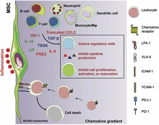 這些分子會誘導(dǎo)與間充質(zhì)干細(xì)胞緊密相關(guān)的免疫細(xì)胞的積累,因此高濃度的 NO(在小鼠 MSCs 中)或色氨酸的消耗(在人類 MSCs 中)會導(dǎo)致免疫細(xì)胞的抑制。其他免疫抑制因子,如 IL-10、TSG6、IL-6、LIF、PGE2、HO-1 和截短的 CCL2 也可能影響免疫細(xì)胞的活化、增殖和功能