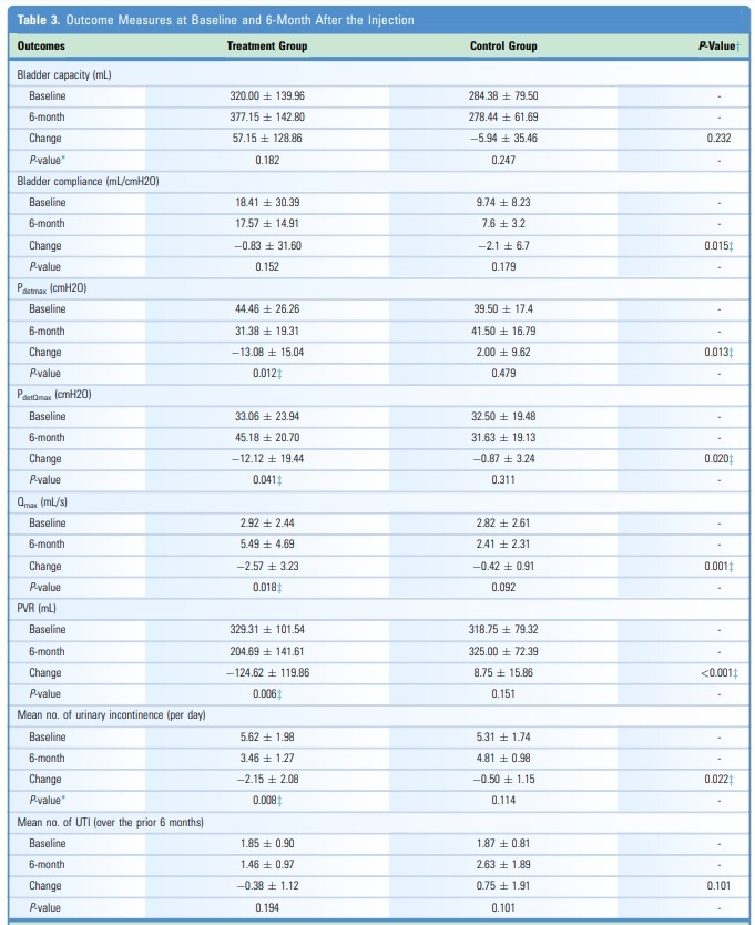 • 進行多元線性回歸分析,控制年齡、性別、損傷程度和損傷發(fā)生后的時間等潛在影響,以評估研究干預(yù)對結(jié)果測量變化的影響。在這方面,多變量分析表明,研究干預(yù)與膀胱順應(yīng)性的變化、PVR、Pdetmax、PdetQmax和Qmax存在顯著關(guān)聯(lián)。