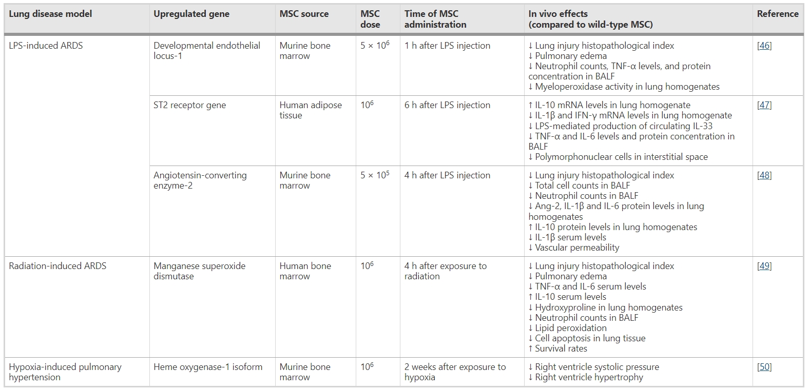 針對(duì)ARDS進(jìn)行基因轉(zhuǎn)導(dǎo)的情況 ARDS是此類(lèi)技術(shù)常見(jiàn)的治療目標(biāo),為有效逆轉(zhuǎn)炎癥過(guò)程,MSCs被轉(zhuǎn)導(dǎo)了以下幾種基因: