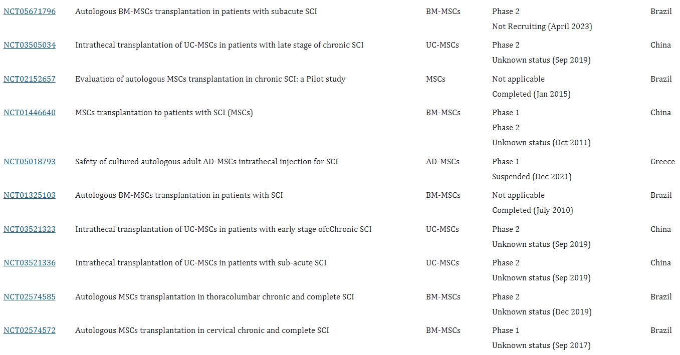 - 骨髓間充質(zhì)干細(xì)胞(BM-MSC):2008年Geffner等人臨床試驗(yàn)(NCT01909154)證明,多種途徑給予BM-MSC對(duì)多種脊髓損傷安全可行,可改善患者生活質(zhì)量。