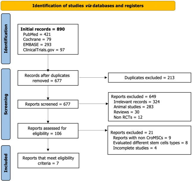 圖1:研究選擇流程圖(PRISMA 圖表)。RCT:隨機(jī)對照試驗(yàn);Cryo-MSC:冷凍保存的間充質(zhì)干細(xì)胞。