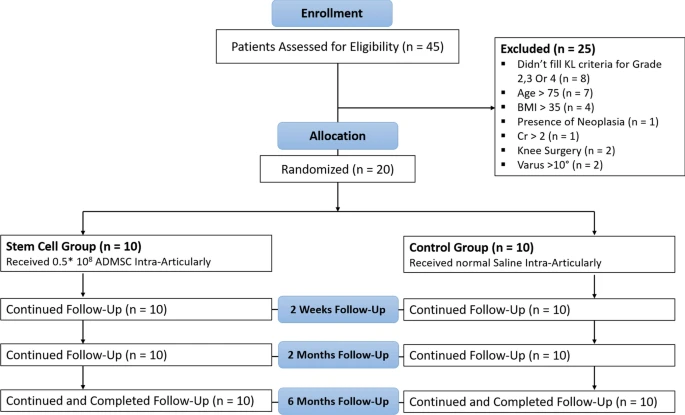 方法:這項(xiàng)三盲介入性臨床試驗(yàn)納入了20例符合美國(guó)風(fēng)濕病學(xué)會(huì) (ACR) 標(biāo)準(zhǔn)的特發(fā)性膝關(guān)節(jié)骨關(guān)節(jié)炎 (OA) 患者。患者被隨機(jī)分配接受關(guān)節(jié)內(nèi)注射0.5×108個(gè)同種異體ADMSC或生理鹽水(對(duì)照組)。