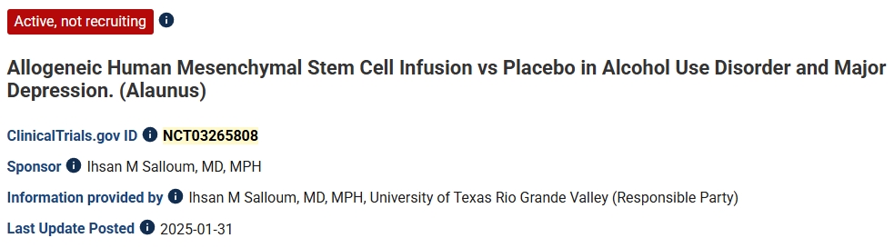 第三項(xiàng):2025年,美國(guó)德克薩斯大學(xué)里奧格蘭德河谷分校進(jìn)行了一項(xiàng)同種異體人間充質(zhì)干細(xì)胞輸注與安慰劑在酒精使用障礙和重度抑郁癥中的療效對(duì)比的臨床研究。