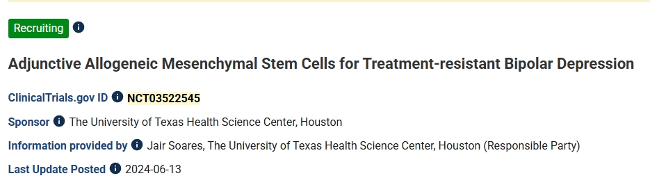 第二項(xiàng):2024年,美國(guó)德克薩斯大學(xué)休斯頓健康科學(xué)中心開展了一項(xiàng)輔助性異基因間充質(zhì)干細(xì)胞治療難治性雙相抑郁的臨床研究。