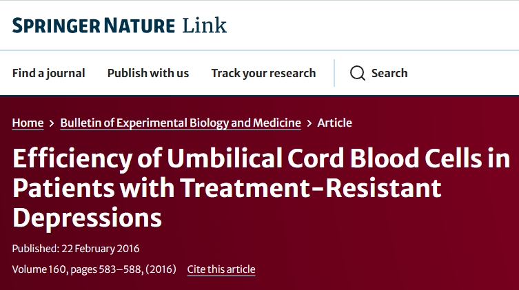 2016年,“實(shí)驗(yàn)生物學(xué)和醫(yī)學(xué)公報(bào)”報(bào)道了一項(xiàng)“臍帶血細(xì)胞對(duì)難治性抑郁癥患者的療效”的臨床研究結(jié)果。