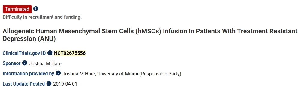 第一項(xiàng):2019年,澳大利亞國(guó)立大學(xué)進(jìn)行了一項(xiàng)異基因人類間充質(zhì)干細(xì)胞(hMSCs)輸注治療難治性抑郁癥患者的臨床試驗(yàn)。