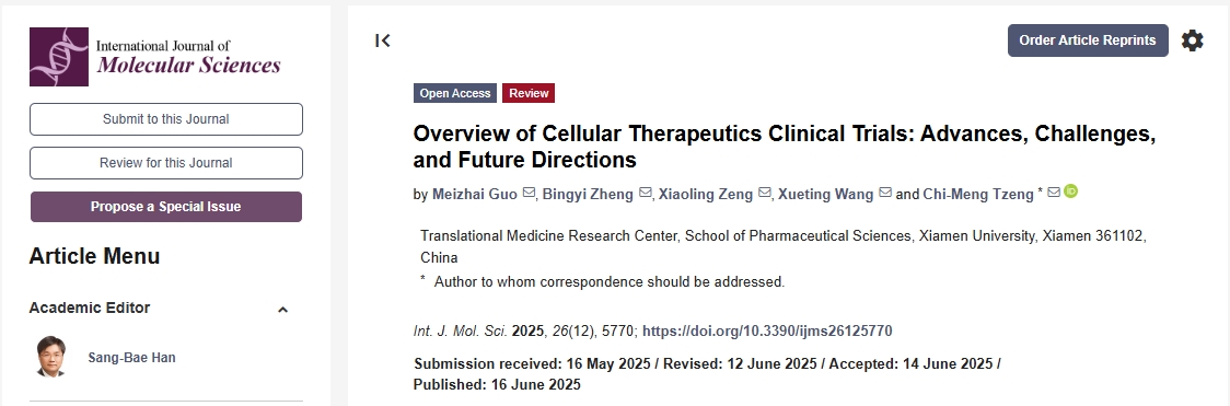 [1]Guo, M.; Zheng, B.; Zeng, X.; Wang, X.; Tzeng, C.-M. Overview of Cellular Therapeutics Clinical Trials: Advances, Challenges, and Future Directions. Int. J. Mol. Sci. 202526, 5770. https://doi.org/10.3390/ijms26125770