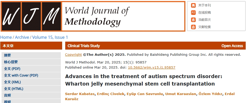 [4]:Kabatas S, Civelek E, Savrunlu EC, Karaaslan U, Y?ld?z ?, Kara?z E. Advances in the treatment of autism spectrum disorder: Wharton jelly mesenchymal stem cell transplantation. World J Methodol 2025; 15(1): 95857