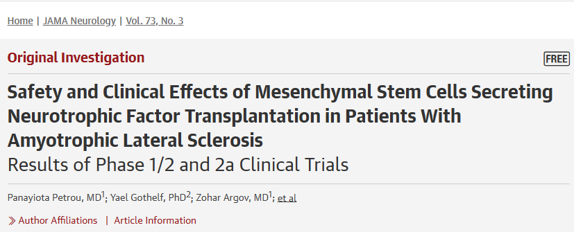 間充質(zhì)干細(xì)胞分泌神經(jīng)營(yíng)養(yǎng)因子移植治療肌萎縮側(cè)索硬化癥患者的安全性和臨床療效1/2期和2a期臨床試驗(yàn)結(jié)果