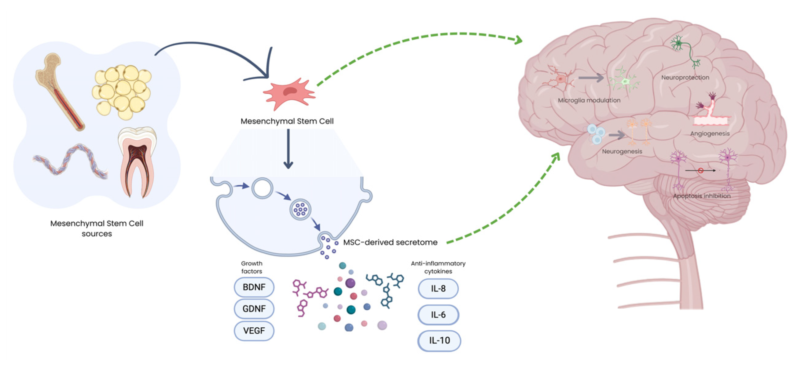 機(jī)制研究表明,這些獲益主要依賴于MSC的旁分泌效應(yīng)——通過分泌神經(jīng)營(yíng)養(yǎng)因子、免疫調(diào)節(jié)分子與細(xì)胞外囊泡,發(fā)揮神經(jīng)保護(hù)、突觸維持與促進(jìn)神經(jīng)發(fā)生的作用,而非依賴細(xì)胞的長(zhǎng)期植入與替代(圖3)。