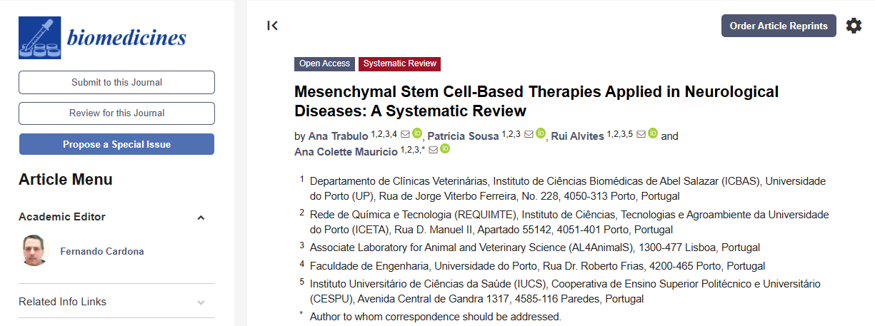 [1]:Trabulo, A.; Sousa, P.; Alvites, R.; Maurício, A.C. Mesenchymal Stem Cell-Based Therapies Applied in Neurological Diseases: A Systematic Review. Biomedicines 202614, 475. https://doi.org/10.3390/biomedicines14020475