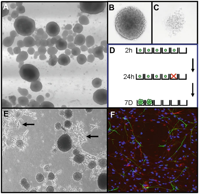 正常神經(jīng)球生長為自由漂浮的球體 (?a?);健康、活的神經(jīng)球將呈現(xiàn)為中心呈深色的實心球 (?b?),而大多數(shù)細胞已發(fā)生凋亡或壞死的神經(jīng)球將呈現(xiàn)松散和蒼白 (?c?)。可將健康神經(jīng)球分離并以 5 個細胞/10 μL 的密度接種于 Terasaki 板中(每板 60 個孔)。接種后(2 小時)立即存在的活細胞數(shù)量可進行定量分析 — 大多數(shù)孔中將有 0 個或 1 個細胞(綠點;d)。培養(yǎng) 24 小時后,很少細胞會開始分裂,但有些細胞將發(fā)生凋亡(紅色 x)。到 7 天時,任何具有自我更新潛力的細胞都將產(chǎn)生包含 >4 個細胞的神經(jīng)球,而無潛力的細胞將發(fā)生凋亡。當在正常粘附板上生長時,神經(jīng)球會粘附、長出突起(箭頭),并開始分化(e)。然后可以使用免疫組織化學(f)檢測,以可視化 Tuj1+神經(jīng)元(紅色)和 GFAP?+星形膠質細胞(綠色)占所有細胞的比例(藍色細胞核;DAPI)