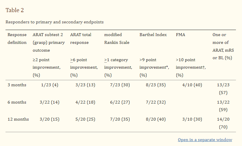 次要結(jié)果:7/23名患者在最后一次觀察時(shí)總ARAT評分有所改善,個(gè)體改善范圍在1到54分之間。五名 (22%) 患者達(dá)到改善≥6分的反應(yīng)標(biāo)準(zhǔn)。沒有參與者表現(xiàn)出統(tǒng)計(jì)分析計(jì)劃中定義的 NIHSS總分發(fā)生10分或更多分的變化,因此從中省略了這一點(diǎn)表2; 然而,只有四名參與者的基線NIHSS>10。在12個(gè)月時(shí),8/20名參與者的Barthel指數(shù)變化≥9分,但無法在基線得分為95或100(上限)的6名受試者中進(jìn)行評估。僅對10名參與者進(jìn)行了Fugl-Meyer 運(yùn)動(dòng)評分,其中3名參與者改善了≥10分。在12個(gè)月時(shí),7/20名參與者的mRS改善了≥1級(詳情見表2)。